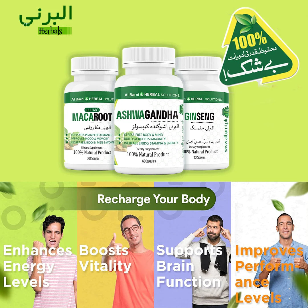 🌿 Ashwagandha, Ginseng, Maca Root - Herbal Power Trio: Ab tayyar ho jaiye apne big day ke liye ek naye andaz mein! Hum lekar aaye hain ek mazbooti se bhara hua Herbal Bundle, jismein shaadi ke liye tayyar hone mein madad karega.