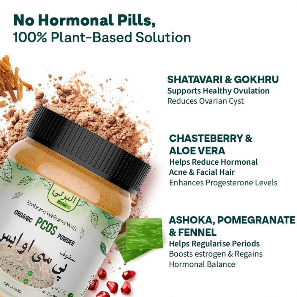 Al Barni natural PCOS Powder helps boost fertility and reduce symptoms. It's made with powerful ingredients like Gokhra, Vitamin B8, and Chromium that help regulate periods and reduce cysts. Plus, it's enriched with herbal extracts like Shatavari and Aloe Vera that help clear skin, reduce facial hair, and control acne.