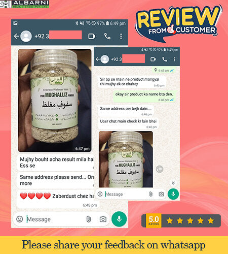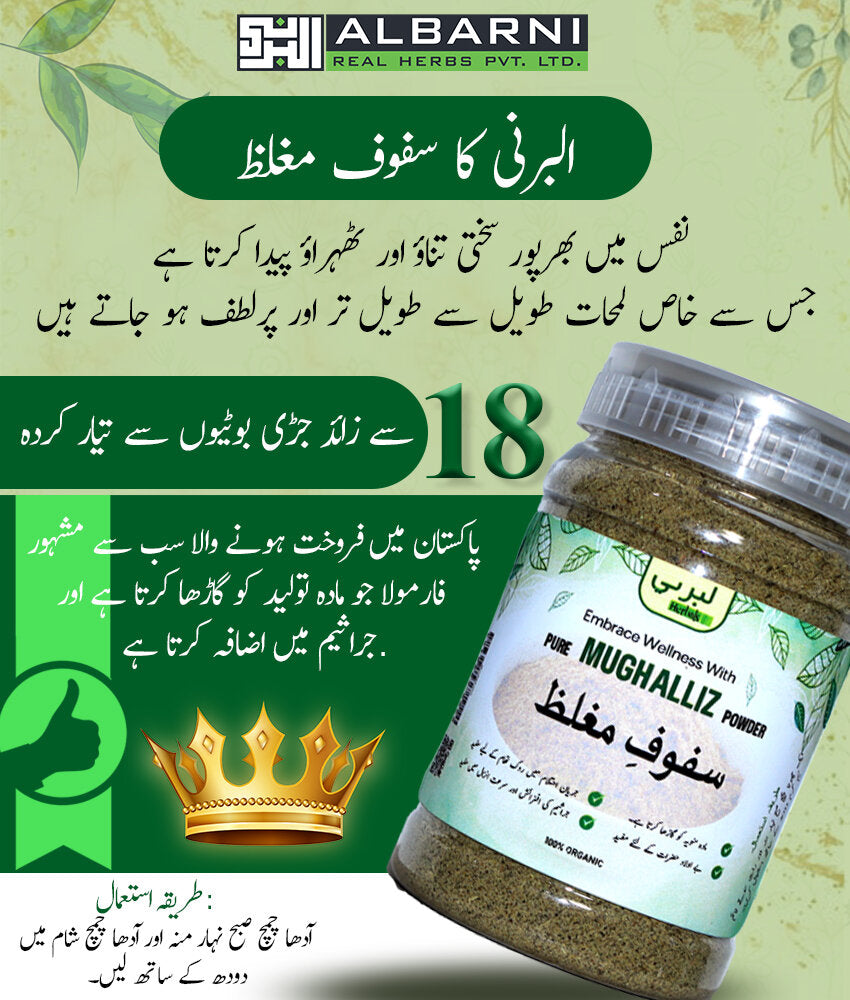Boost your sperm count, volume, and stamina with Safoof e Mugaliz, a premium natural powder formulated with 18 proven and authentic herbs. These carefully selected ingredients have been used for centuries to support men's reproductive health.